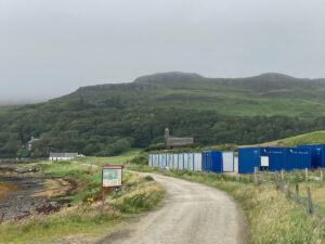Canna House (left) Isle of Canna, run by the National Trust for Scotland. The Canna House Archive is not permitted to leave the island and is housed in temporary containers (centre and right) near the quay while building refurbishment takes place. Photo: (c) Gordon Turnbull