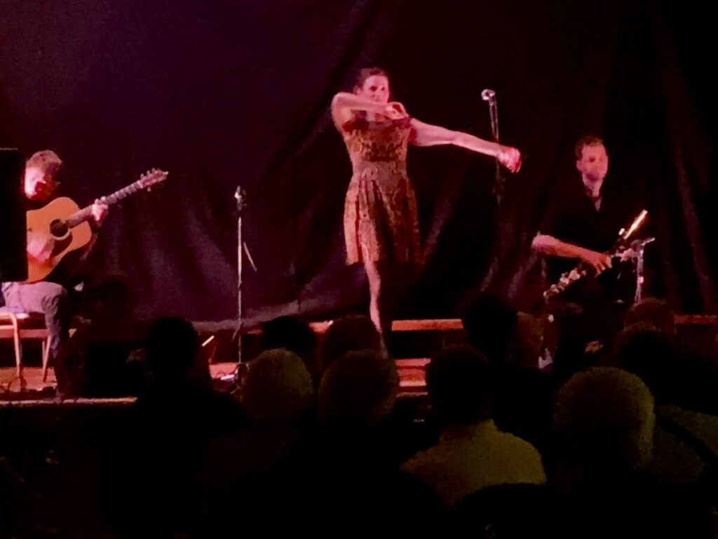 A mix of newly composed tunes with older ones from his native Moray, the blend was finely balanced. Luc’s guitar alternated between rhythm and melody, the bell-like tones augmented by a bass octave pedal to give a sudden sonic depth to the music. The top end of the sound was provided by Sophie’s intricate percussive steps, sometimes highlighting the beat, at other times playing off the melody line.