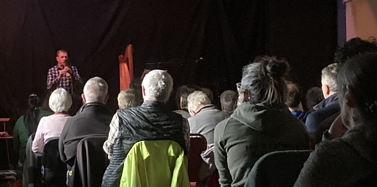 There was a veritable buzz and a sense of occasion as people gathered in the atrium and the hall beforehand. The first half of the evening saw Dougie Pincock take the stage in front of a packed hall to promote the humble D whistle with a versatile and dazzling performance that included tunes in keys that normally wouldn’t be played on the instrument. The audacity and dexterity brought audible gasps from an audience that included many musicians.