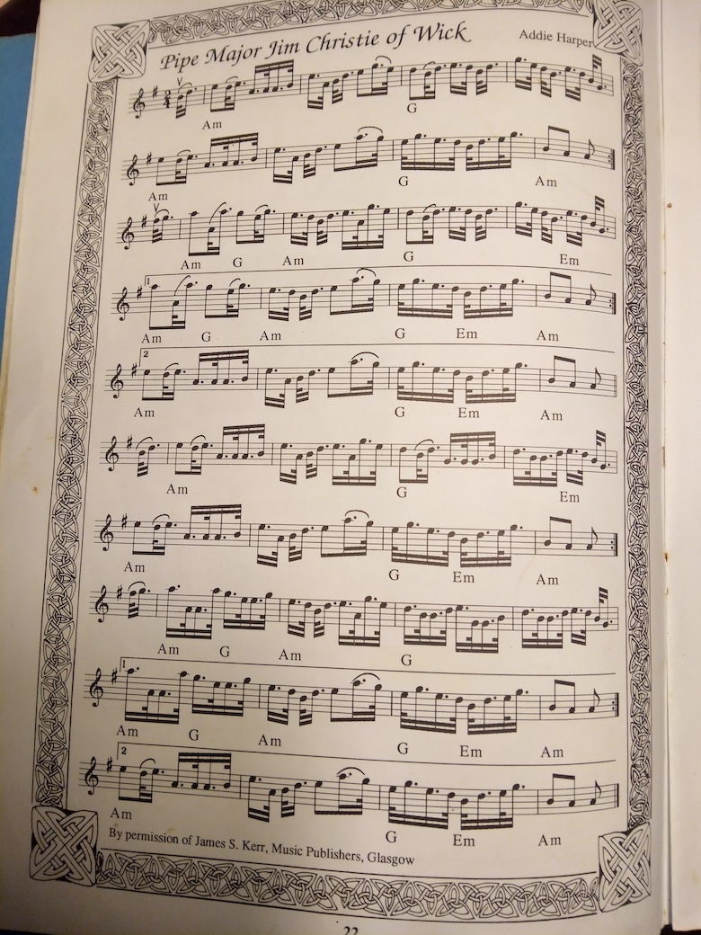 Pipe Major Jim Christie of Wick was written by Wick fiddler Addie Harper. Apparently one of Addie Harper’s earlier compositions, it sits neatly in the bagpipe scale and suits flutes and whistles well too. I find the structure encourages a pulse of breath that makes it flow along readily. Look out for variations in the deployment of snaps in the melody.