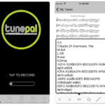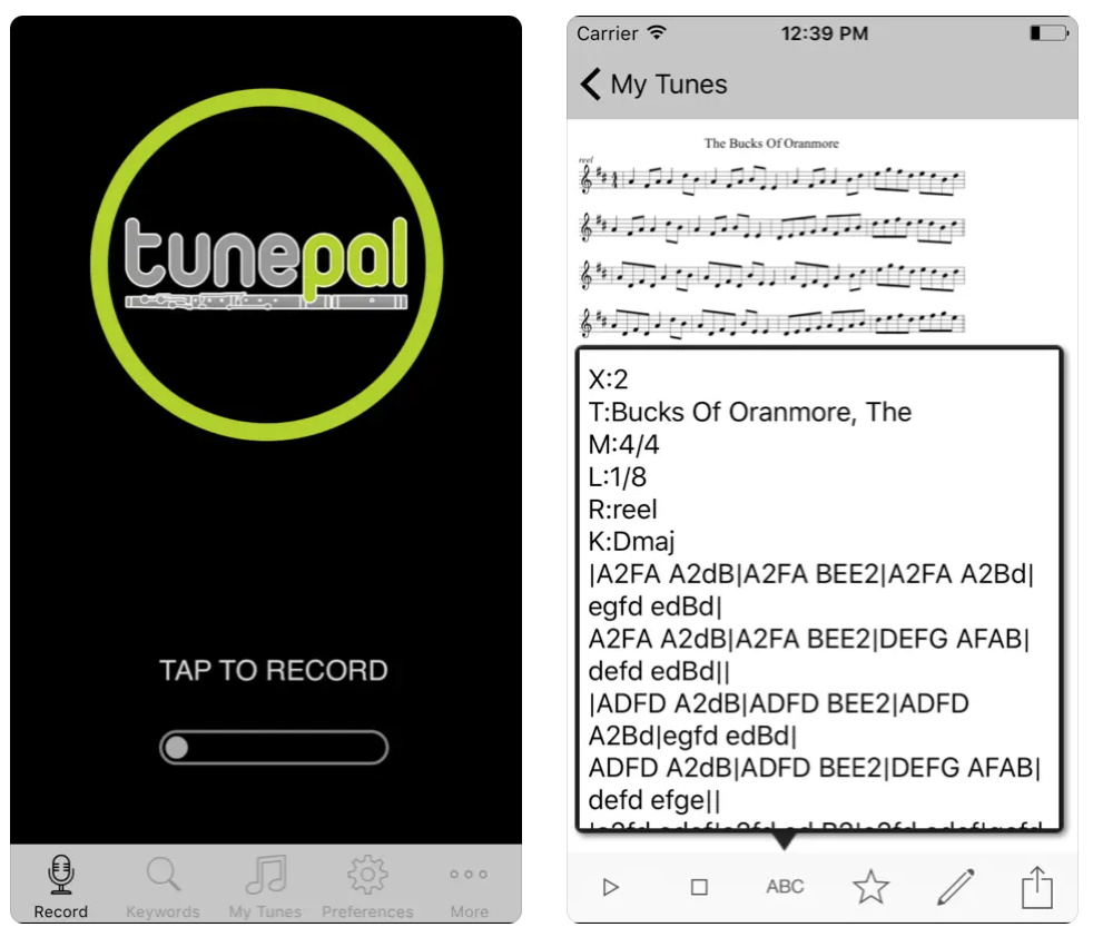 Mobile phone screenshots of the Tunepal logo, music score and letter notation in ABC format.